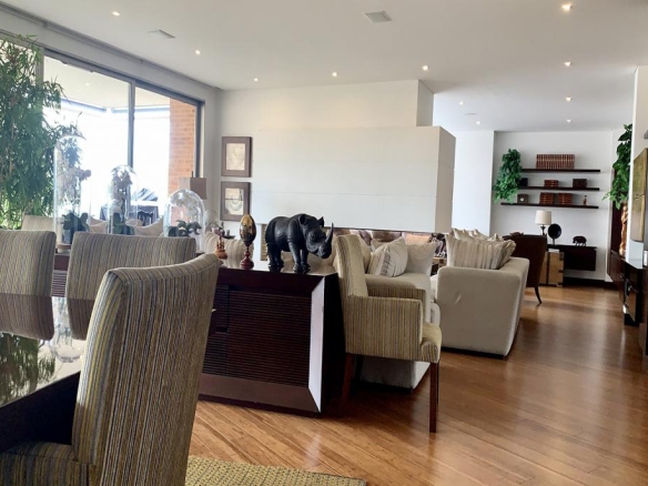Hermoso Apartamento remodelado, exterior e interior, ubicado en El Refugio, área privada de 350 metros; consta de dos salas que se comunican con una chimenea a gas, comedor independiente, baño social, hall de habitaciones, estar de habitaciones, 3 habitaciones cada una con su baño, closet, alcoba principal cuenta con jacuzzi masajeador, baño privado y vestier. La cocina es estilo italiano, abierta, con dos hornos: uno eléctrico y otro a vapor, zona de lavandería independiente con toda la línea blanca, cuarto y baño de servicio; El edificio tiene gimnasio, salón social, senderos verdes alrededor. Se encuentra ubicado vía La Calera, cerca de la zona T. Acceso por la circunvalar, carrera 7, Calle 85 y calle 94.