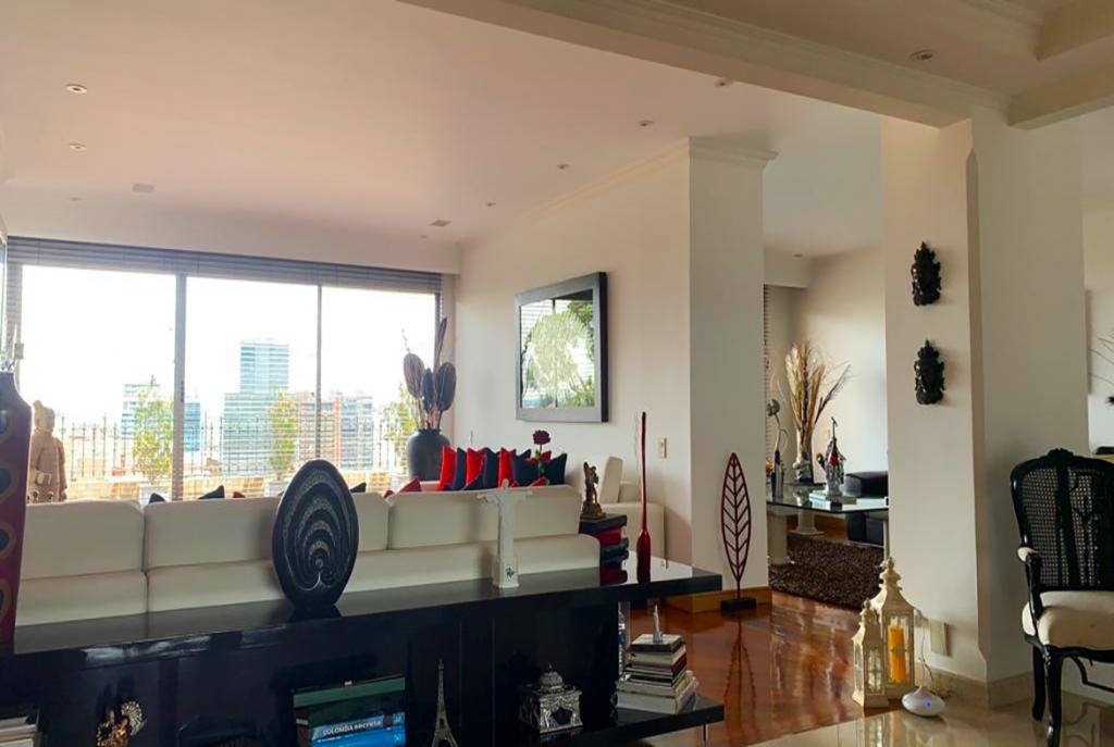 Hermoso Apto ubicado en conjunto exclusivo, con senderos verdes para caminatas y paisajes verdes ubicado en Santa Barbara Alta con área 300 metros, el apartamento es dúplex, en el primer nivel encontramos las áreas sociales como una amplia sala, comedor independiente, biblioteca, sala de TV, cocina integral cerrada con comedor adicional, zona de lavandería, baño social y cuarto y baño de servicio y una hermosa terraza con vista hacía 180 grados a la ciudad; en el segundo nivel se encuentra la parte privada del apartamento, consta de tres habitaciones cada una con su baño, closet/Vestier, y en la habitación principal hay una bella terraza con vista hacia los cerros y hacía los senderos; El conjunto cuenta con gimnasio, zonas húmedas, salón social, zona de niños, zona de BBQ, cancha de squash, piscina, senderos verdes y zona de niños. El conjunto esta cerca al Centro Comercial Santa Ana, Hacienda Santa Barbara, Clínica Santa Fe. Vías de acceso carrera 7, 9 y 11, Calle 106, 116 y 127